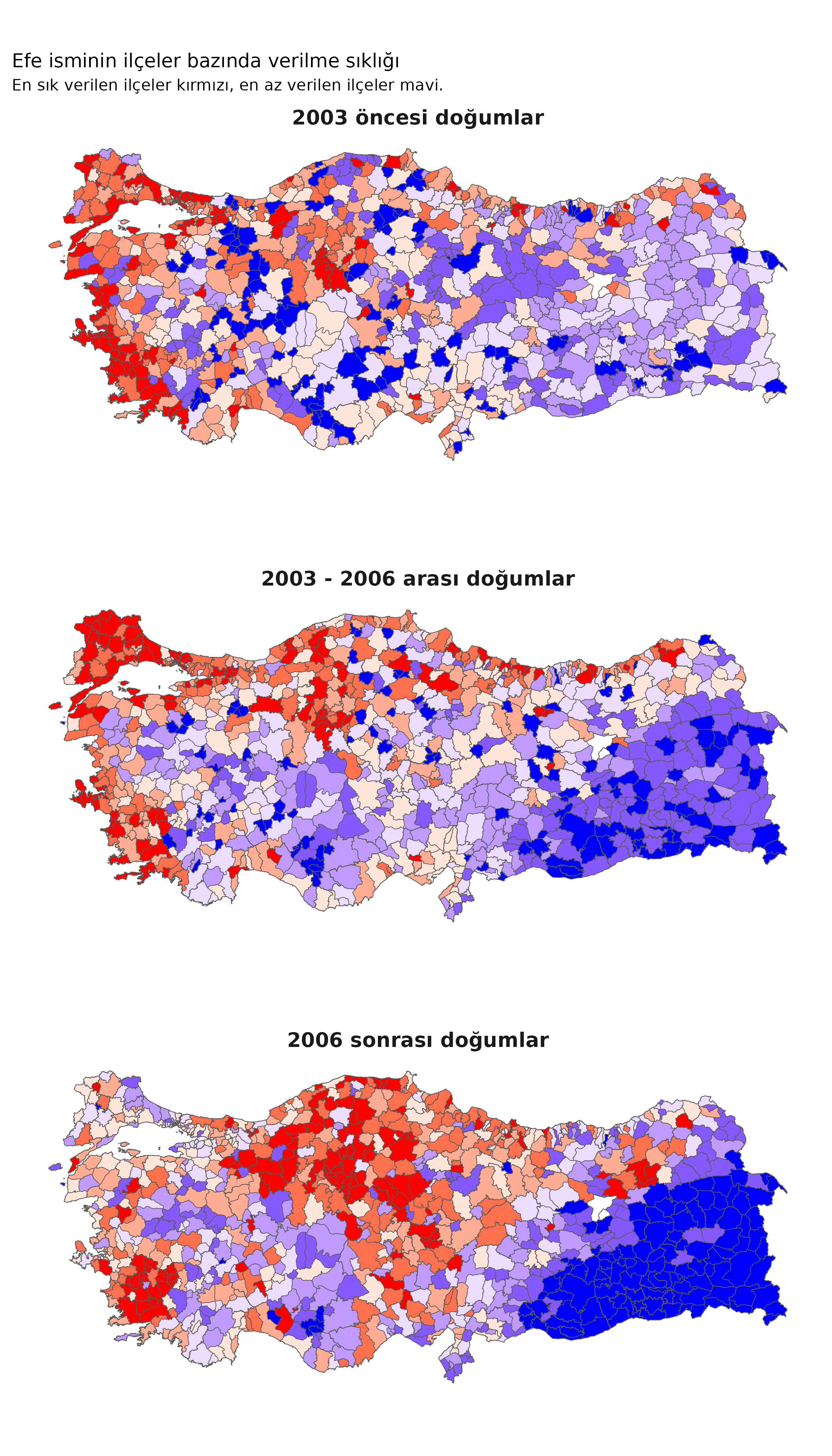 Efe, 2003’e kadar Ege kıyıları ve Trakya’da popülerken, 2003-2006 arası bir taban kayması yaşamış. 2006’dan bu yana Orta Anadolu Efe isminin en popüler olduğu bölge ve Orta Doğu Anadolu ile Güneydoğu Anadolu’daki kullanımı (ülkenin diğer kısımlarına göre) geride kalmış.